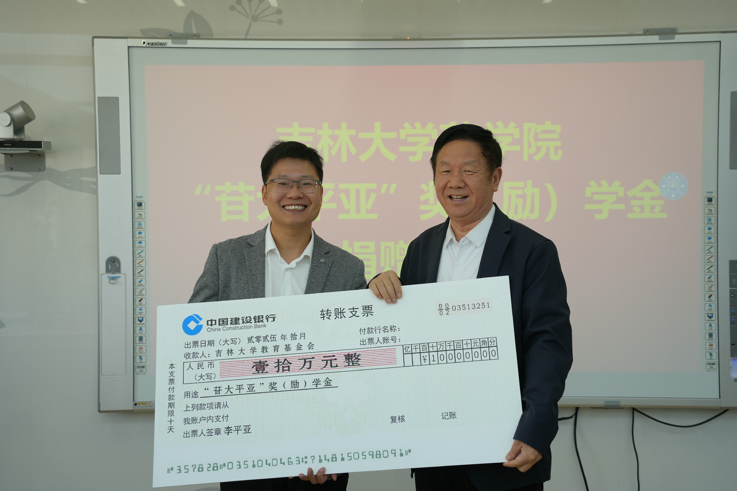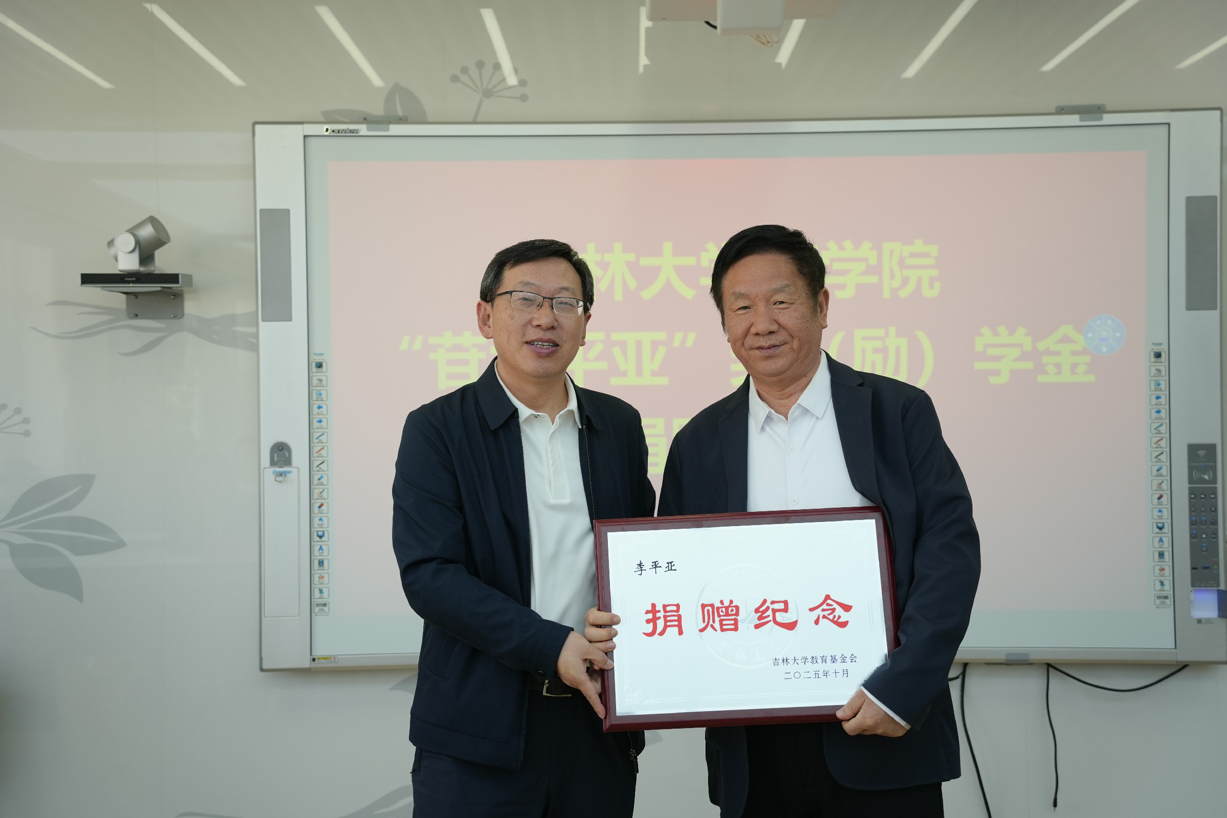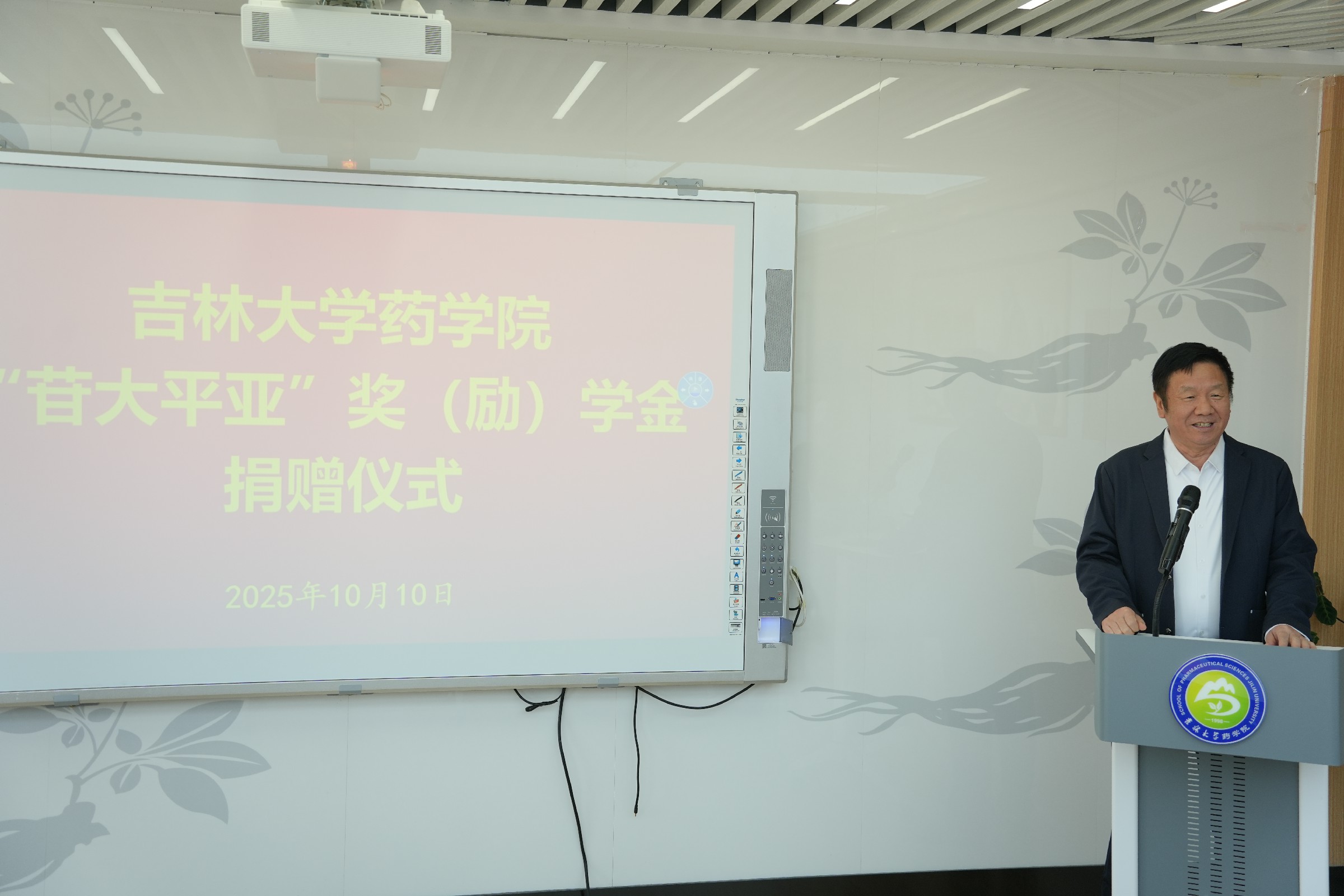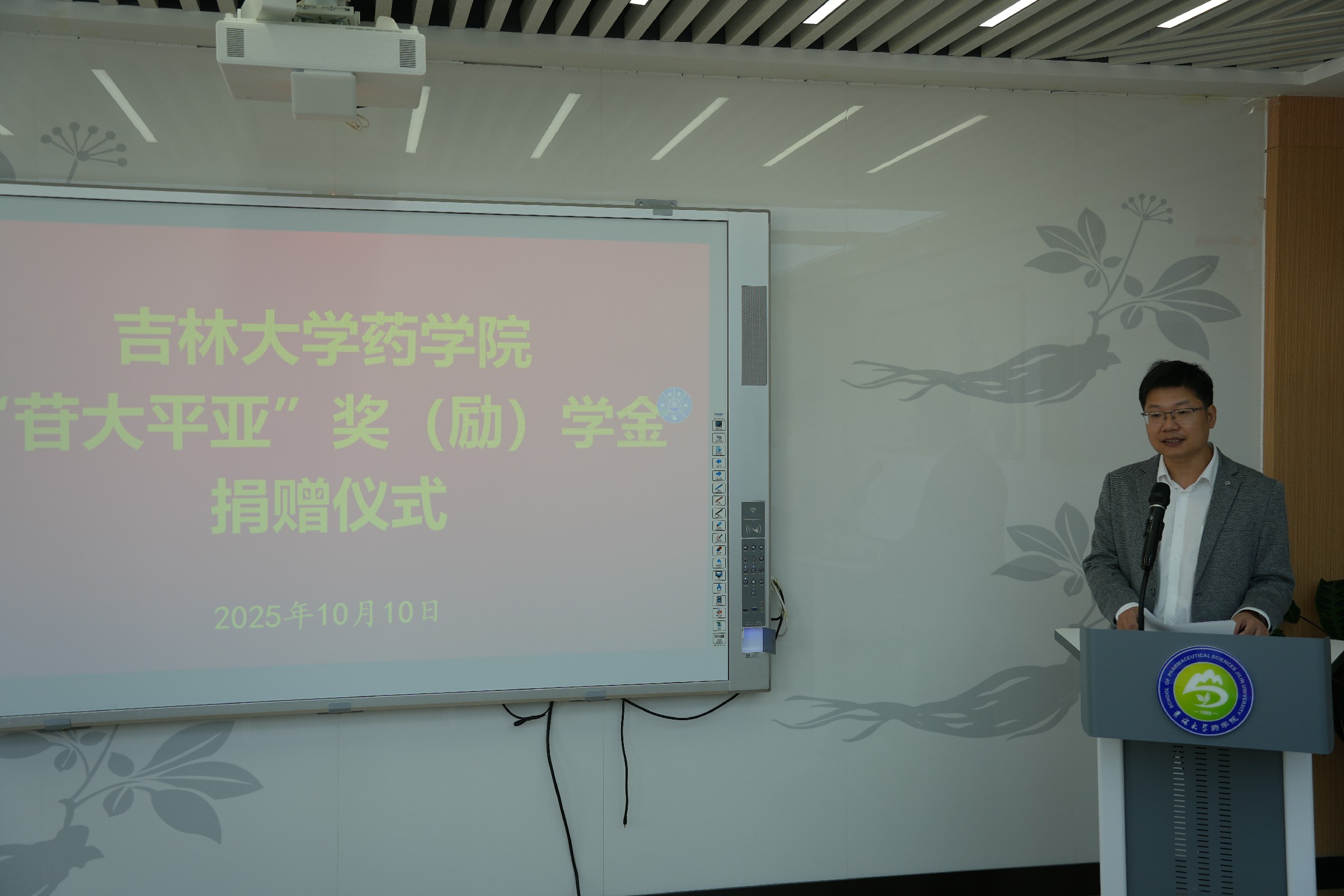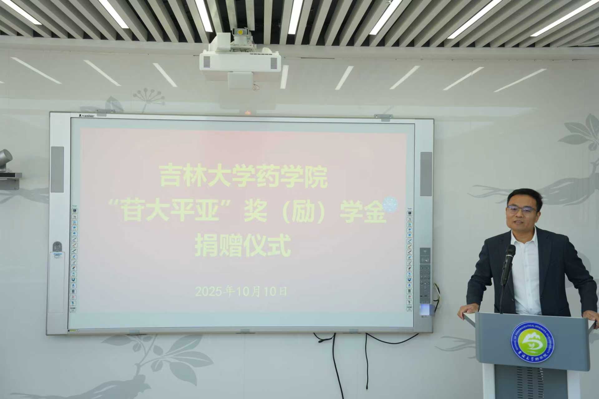 2025年10月10日上午,吉林大学药学院“苷大平亚”奖(励)学金捐赠仪式在学院514会议室隆重举行。吉林大学校友和基金工作办公室主任康永刚、副主任王婷婷、白求恩医学部副学部长兼综合办公室主任钟绍峰、捐赠人李平亚教授,药学院院长项金宝以及学院班子成员、研究生代表共同出席。仪式由学院党委书记孙曙光主持。