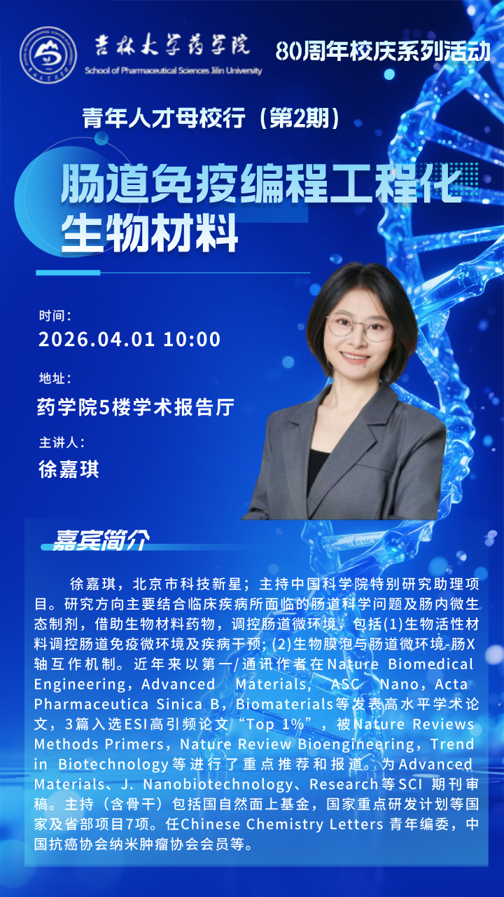 4月1日上午,吉林大学药学院80周年校庆系列活动之青年人才母校行(第2期)在药学院5楼学术报告厅顺利举办。本次讲座邀请北京市科技新星,中国科学院大学徐嘉琪副研究员,带来题为《肠道免疫编程工程化生物材料》的学术分享,本次报告由副院长曹霞主持,院长项金宝及药学院师生代表参会学习。徐嘉琪副研究员围绕肠道免疫调控的核心科学问题,系统阐释了工程化生物材料在调控肠道微环境、干预肠道相关疾病中的作用机制,详细介绍...