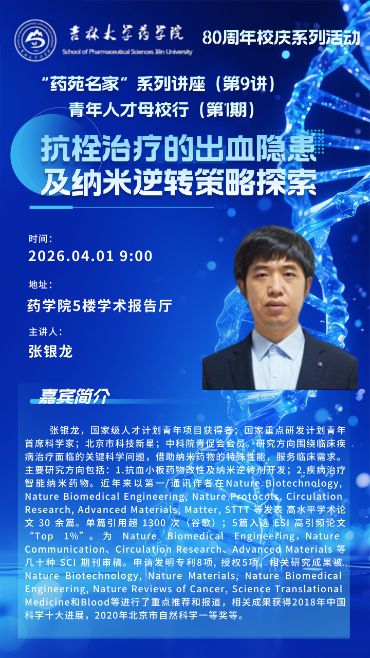 4月1日上午,吉林大学药学院80周年校庆系列活动之“药苑名家”系列讲座(第9讲)暨青年人才母校行(第1期)在药学院5楼学术报告厅顺利举办。本次讲座邀请国家级人才计划青年项目获得者、国家重点研发计划青年首席科学家,中国科学院大学张银龙教授,带来题为《抗栓治疗的出血隐患及纳米逆转策略探索》的学术分享,本次报告由副院长曹霞主持,院长项金宝及药学院师生代表参会学习。张银龙教授围绕临床抗栓治疗的核心痛点,系统剖...