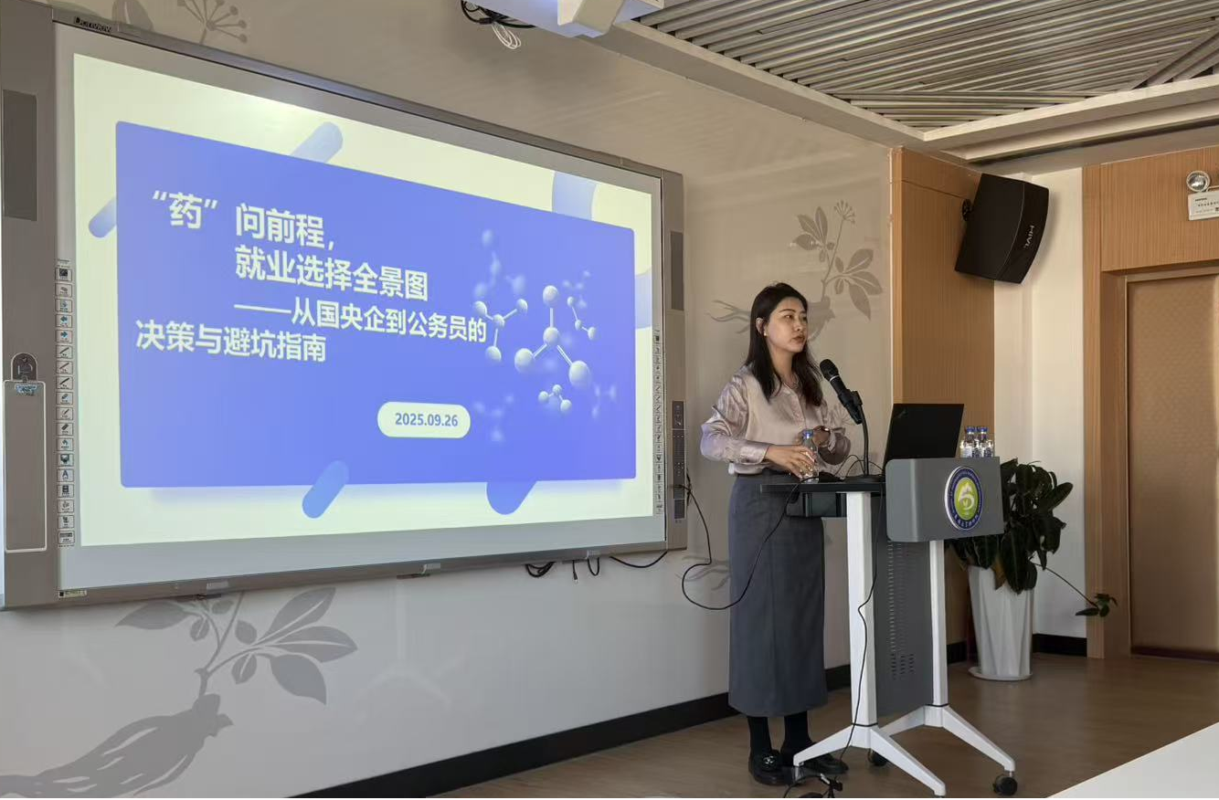 为帮助药学院2026届毕业生明晰就业方向、规避求职风险、科学规划个人发展,2025年9月26日上午,药学院特邀吉林大学学生就业创业指导与服务中心指导科科长、就业创业指导教师孙卓,为全体毕业研究生作了题为“药问前程,就业选择全景图”的专题就业指导讲座。
