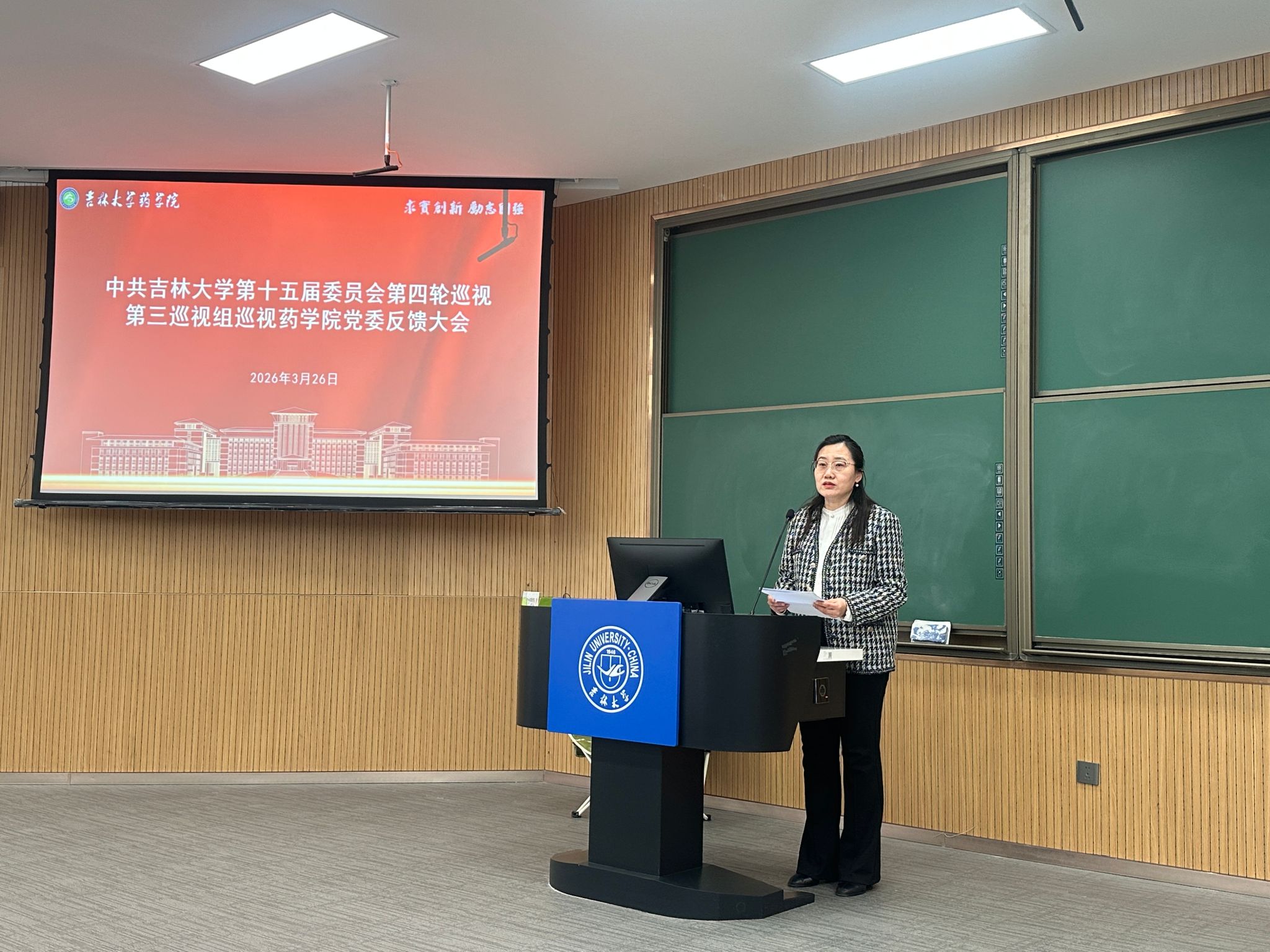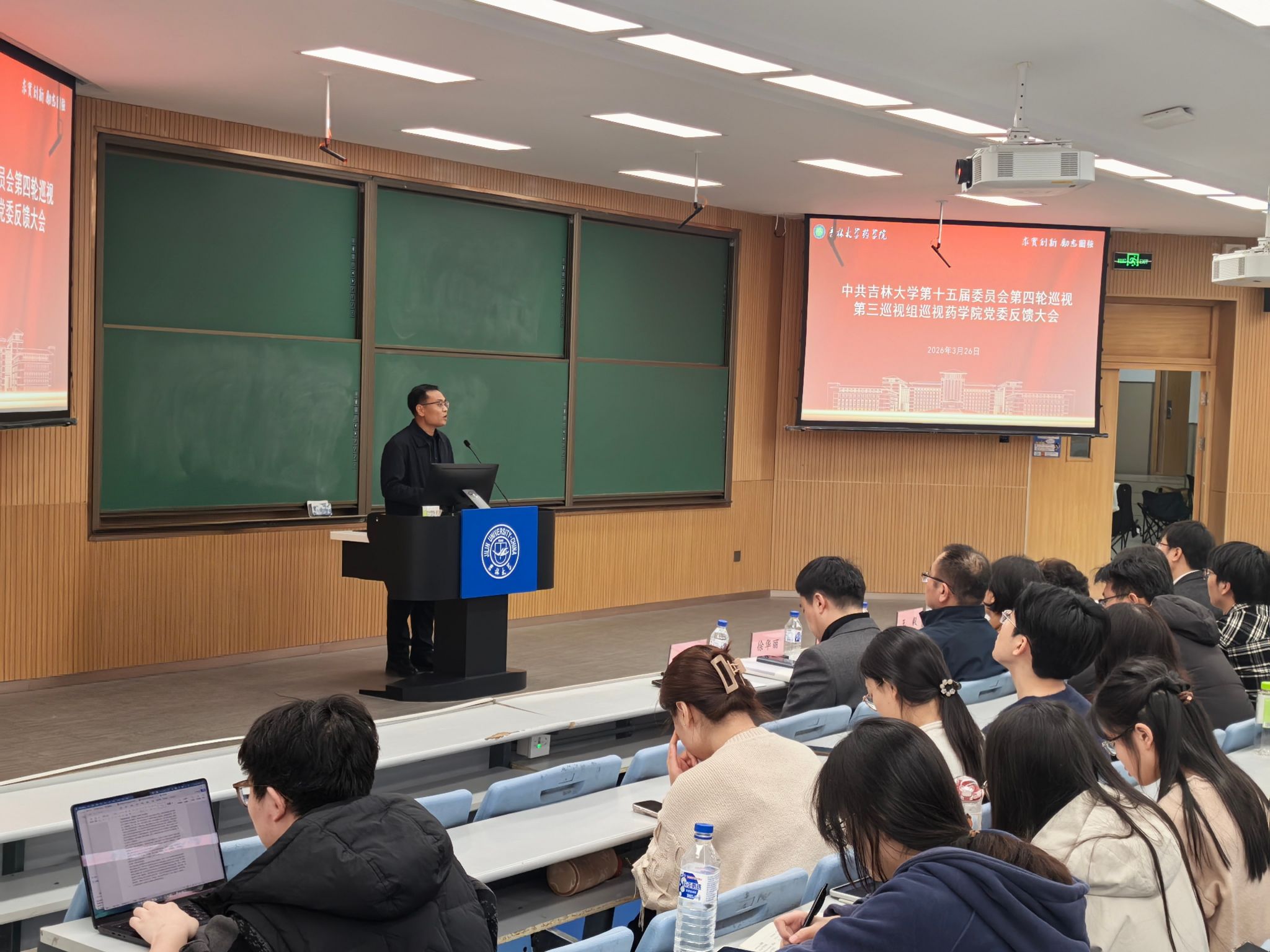 2026年3月26日14时,学校党委第三巡视组向药学院党委反馈巡视情况。学校党委第三巡视组组长朱丽雅及全体成员、学校纪检监察机构、党委巡视工作办公室和党委组织部派员参加反馈会议;药学院领导班子全体成员,近三年退出管理岗位的班子成员,党委委员、纪委委员,学术委员会主任委员、学位评定分委员会主席、教学委员会主任,党支部书记、系(科室、所、中心)主任,教职工代表、学生代表等参加了会议。会议由药学院院长项金宝主持。
